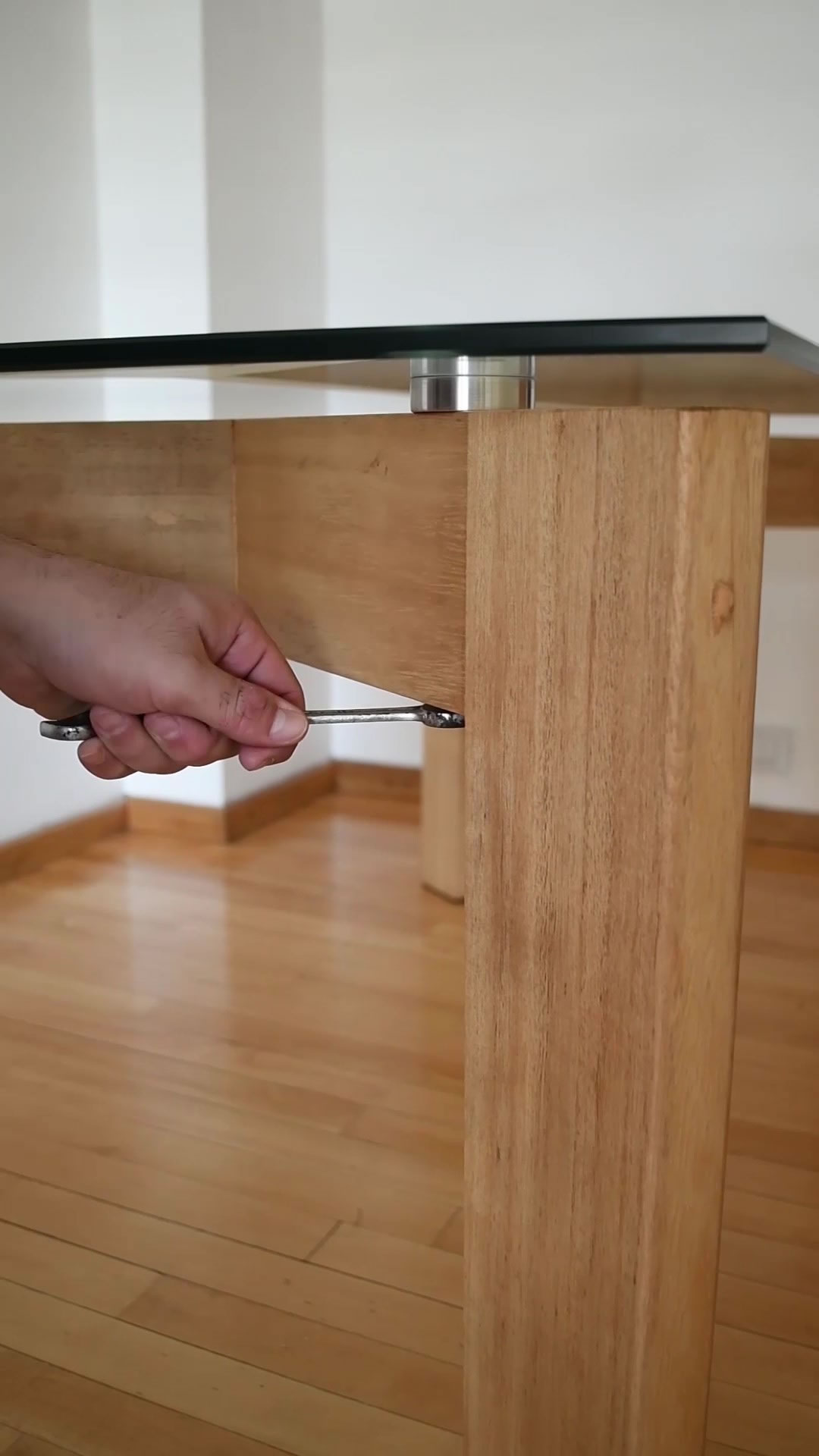 - Levantar apenas un lado del vidrio en la zona de la cabecera de la mesa (ancho del vidrio), a fin de poder colocar sellador invisible en el centro de las terminaciones de la madera de la base. De esta forma el sellador quedará entre la madera y el inserto rectangular (el cual está previamente pegado al vidrio)