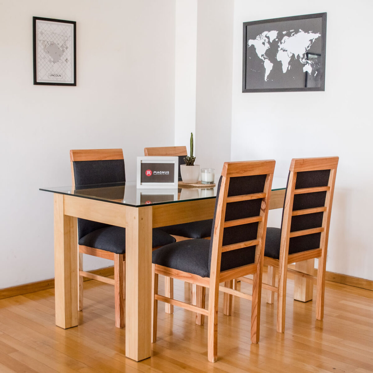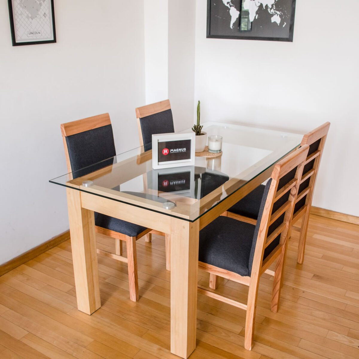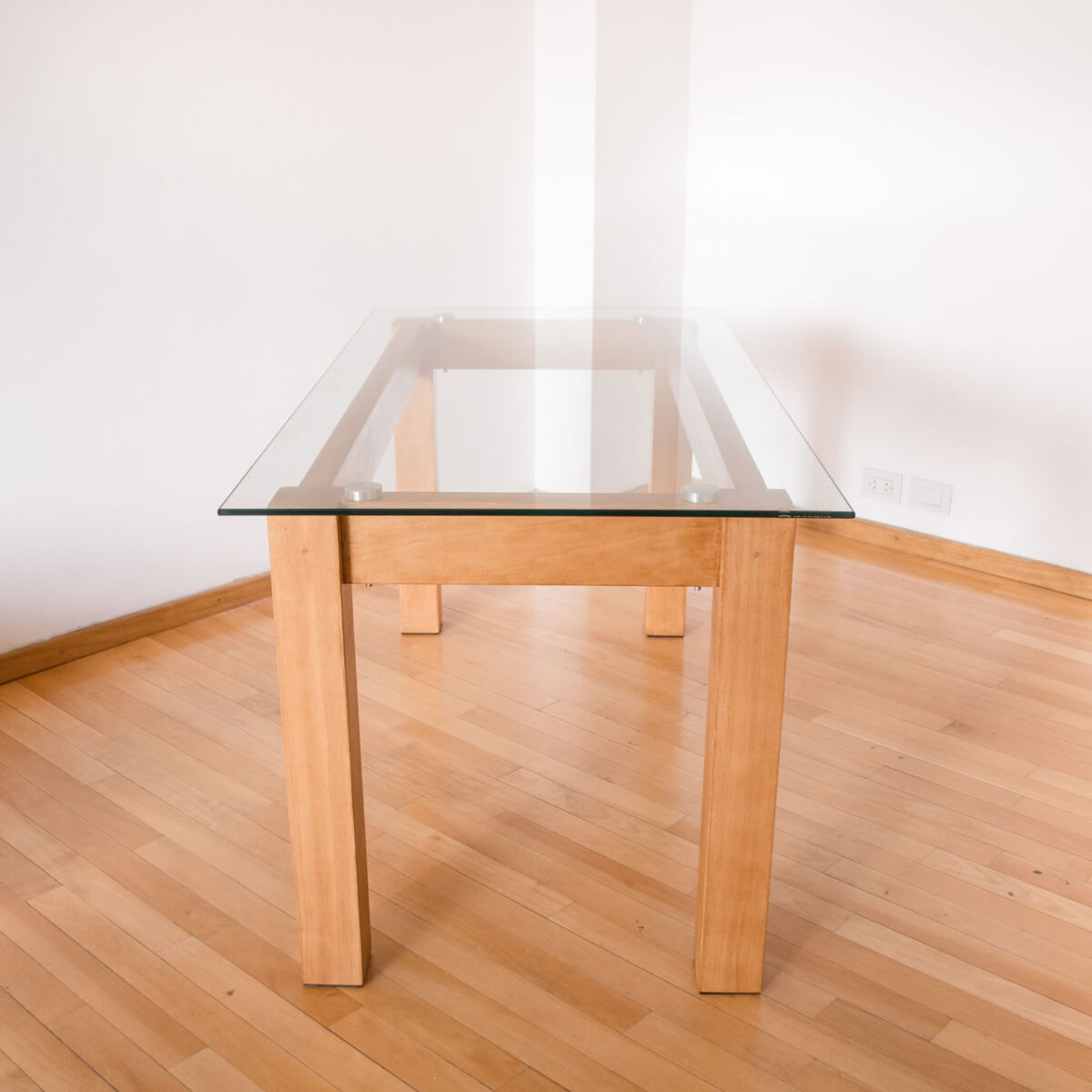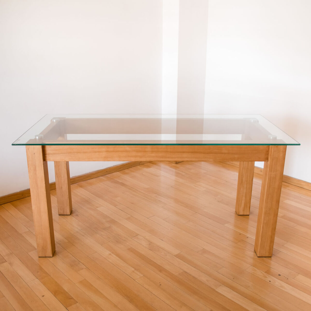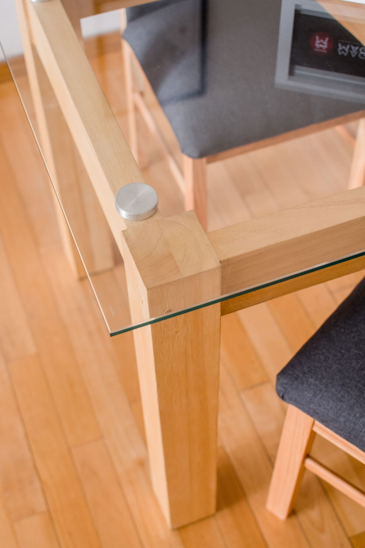 Nuestras mesas son desmontables! El vidrio no va apoyado sobre la base, trabajamos con insertos de aluminio que se pegan, mediante un proceso especial, al vidrio y, a su vez se encastran en la madera, lo que permite que sea fácil de trasladar y a su vez no se deslice o corra.