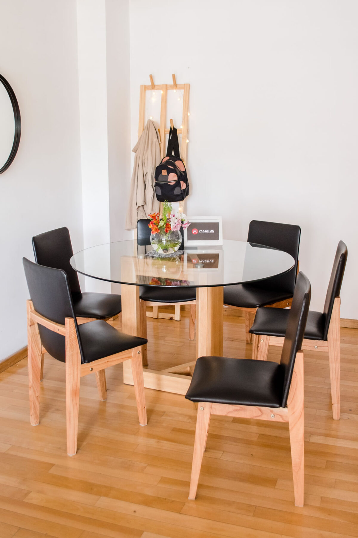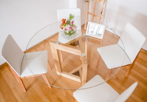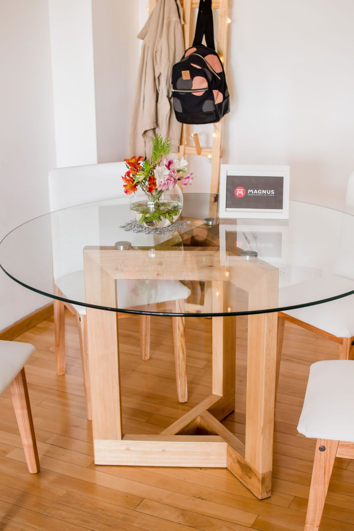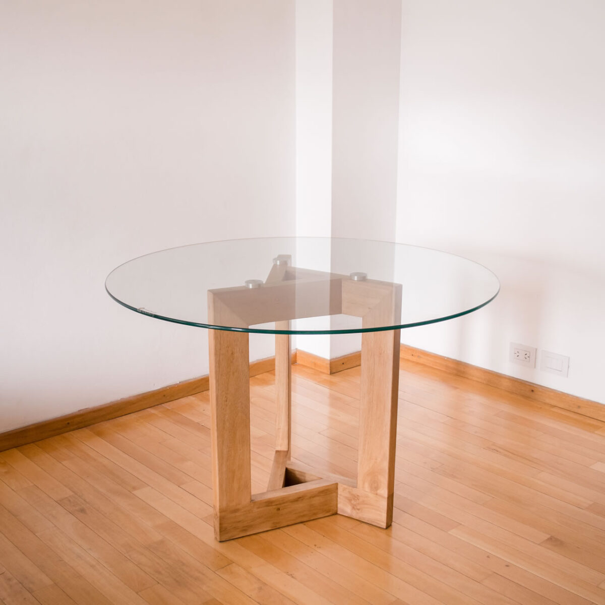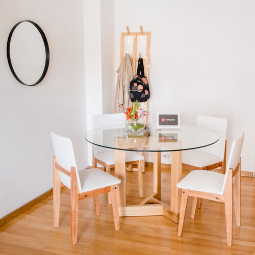 Nuestras mesas son desmontables! El vidrio no va apoyado sobre la base, trabajamos con insertos de aluminio que se pegan, mediante un proceso especial, al vidrio y, a su vez se encastran en la madera, lo que permite que sea fácil de trasladar y a su vez no se deslice o corra.